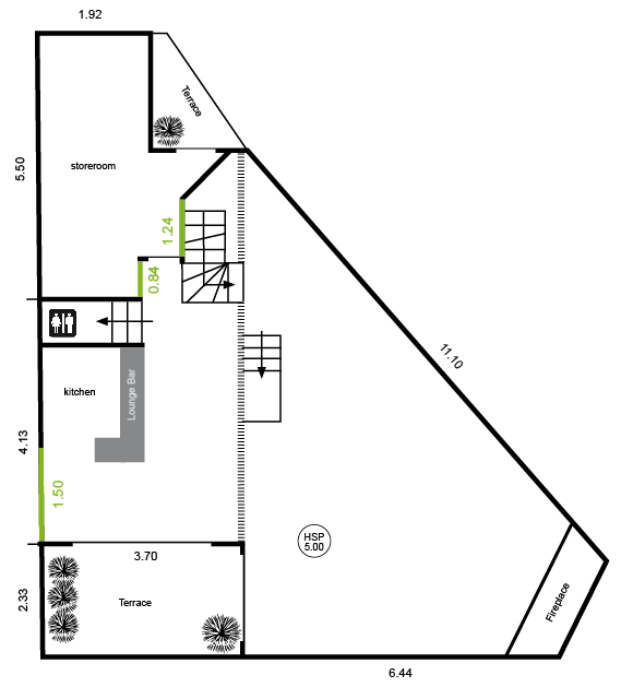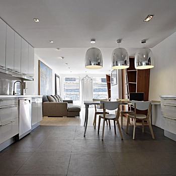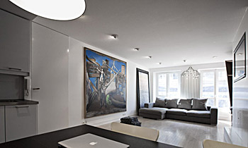 This area is 60 square meters with an entrance, an open plan kitchen, and an exhibition lounge.